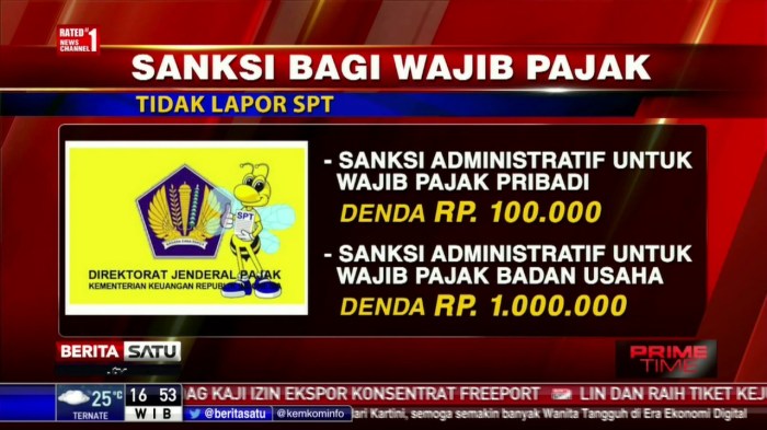 Denda bagi wajib pajak yang telat lapor SPT sebesar Rp 100.000 untuk wajib pajak orang pribadi dan Rp 1 juta untuk wajib pajak badan.