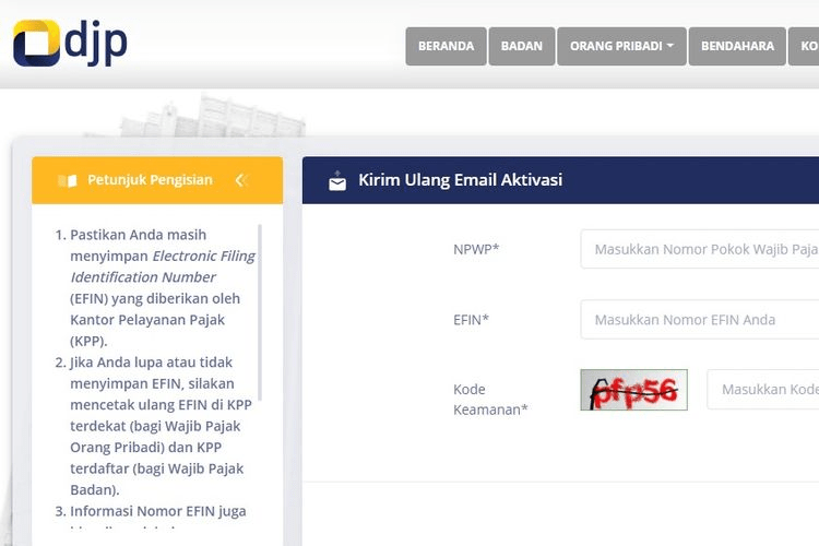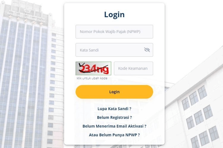 Buka djponline dengan memilih LOGIN pada http://www.pajak.go.id, masukkan NPWP dan kata sandi, lalu masukkan kode keamanan/CAPTCHA, dan klik “Login”.